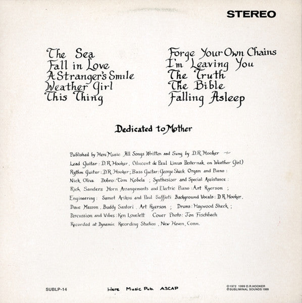 © 1972 1999 D.R. Hooker Ⓟ Subliminal Sounds 1999 Edition of 500 comes with gatefold insert of lyrics Yellow on black spiral labels