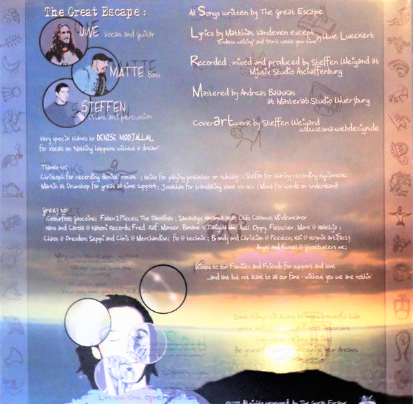 150g White Vinyl - Gatefold Cover Recorded, mixed and produced at Mjusix Studio, Aschaffenburg, Germany Mastered at Masterlab-Studio, Würzburg, Germany Etching Side D: Some things will always be more powerful than space and time - and more important than words, or how your live: Be yourself, learn to recognize your dreams, and follow them. If you follow your heart, doors will open where you didn't think there were any and where they don't exist for others. Catalog# on cover's spine: NASONI 40 Catalog# on center label: Nasoni 040 © 2004 by The Great Escape Made in Germany
