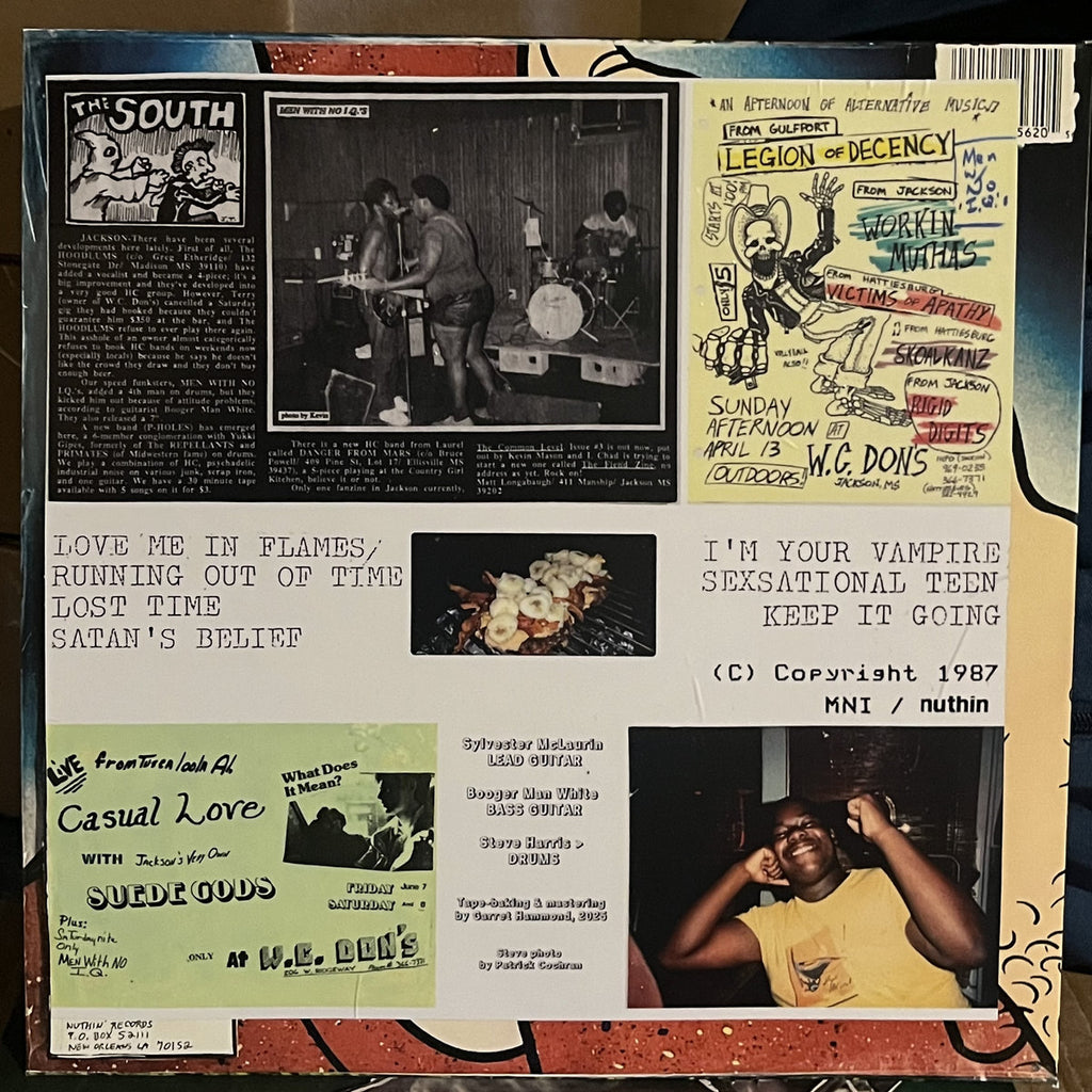 "When I was 15 I used to sneak in to a dive called W.C. Don's in Jackson, Miss to see the monthly hardcore shows that seemed to come around at that point. Inevitably, Men With No IQ's would be opening the show. They were three African American guys who looked about as out of place as anyone ever could. The bass player, Booger Man White and the drummer, Steve Harris (no relation to the bass player from Maiden) were so huge that they would literally dwarf their tiny pawn shop instruments. Sylvester was the hot shot of the band, and he had like 10 Peavey practice amps, all stacked up on one another. Sylvester would always play with his shirt off while the other two guys wore custom MNI shirts and baseball caps that were most likely made at one of those iron-on shops in the Jackson Mall. THEY WERE AWESOME. I regret to say that I didn't appreciate them nearly enough at the time but they would always SLAY." --MySpace fan, via WFMU's Beware of the Blog
